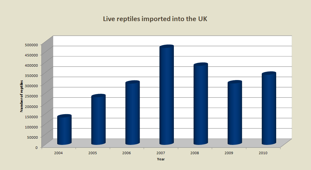 An estimated 350,000 live reptiles were imported into the UK in 2010, while more than 1.6 million were imported by the EU in 2011. Between 2009 and 2010 UK reptile imports increased, as did the proportion of animals that was wild-sourced. In 2012 the Pet Food Manufacturers' Association estimated an exotic pet population of approximately 42 million. The number of snakes, lizards, tortoises and turtles fell from 900,000 in 2011 to the previous 2010 figure of 700,000. In 2011, the RSPCA Cruelty and Advice line dealt with 7073 complaint or collection calls about 32,426 exotic animals. Click here to see live reptiles imported into the UK Click here to live CITES-listed reptiles imported into the UK -