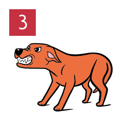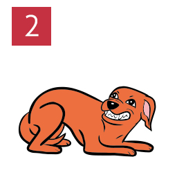 The dog’s weight is forward. Hair is raised and their tail is up and stiff. Their eyes are looking at you, with dark, enlarged pupils. Ears are up, and their nose is stiff and wrinkled.