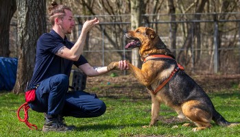 - With your dog in a sitting position and a treat in your hand, move your hand from your dog's nose towards their chest, then straight down towards the floor.