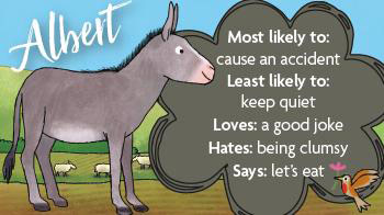 Albert is a clumsy animal, a donkey who can never stay quiet, as hard as he tries! He loves to spend his days rolling around laughing at Harry's jokes and of course, eating a good snack (or three!)