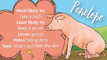 Penelope loves to pamper herself in in the water nearly as much as she loves to gossip! She's always the first animal to hear a story and the first pig to go to for news. Oh, and you'll never find her near mud, yuck!