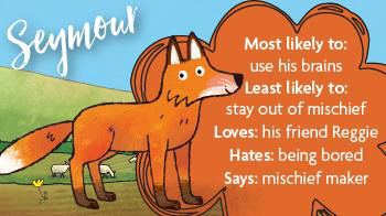 A smart fox, Seymour sometimes gets himself into trouble with his clever ideas. He can usually be found plotting with his best friend Reggie, and when he's not getting into mischief, he's playing hide and seek on the farm with the other animals!