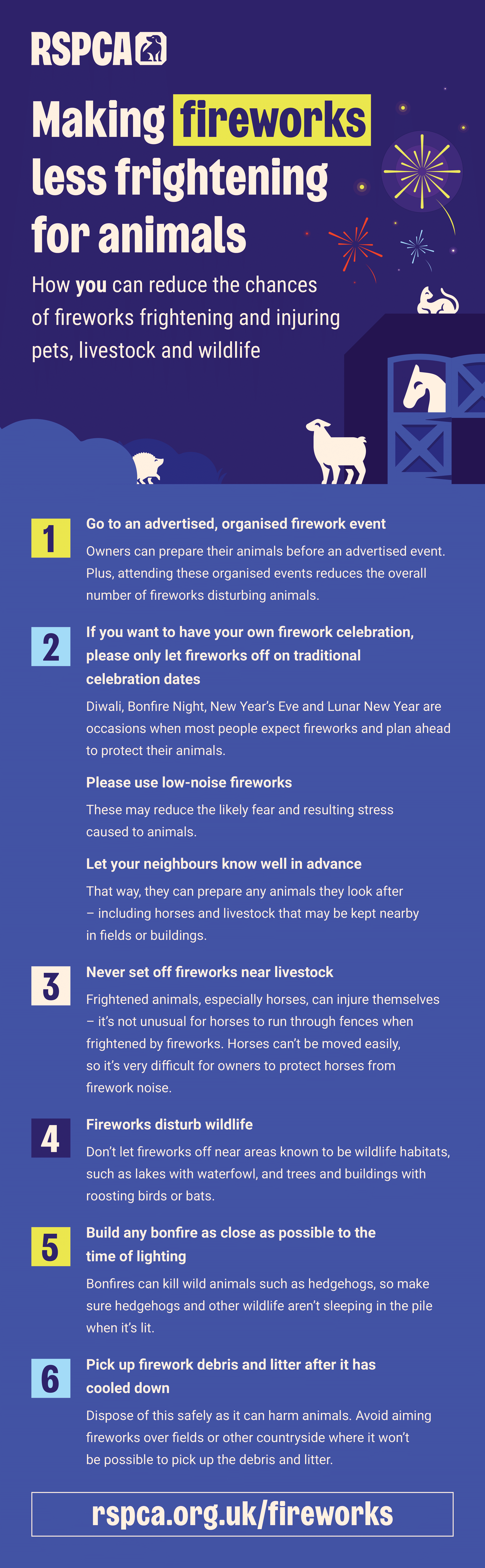 - Engage with neighbours and the local community: Alert them to the presence of livestock on the land and the impact fireworks can have. Find out if they’re planning any firework displays and let them know your concerns.