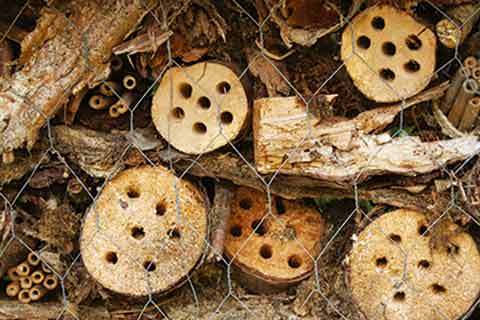Pack more bug hotels between wooden pallets or bricks. Surround with logs, bricks, bundles of sticks and dry grass to make a minibeast mansion.