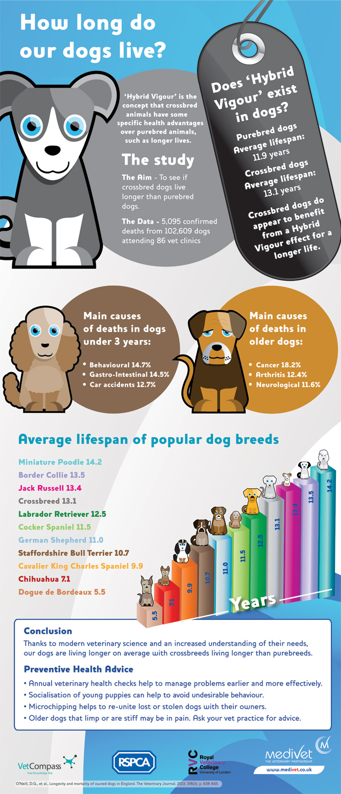 Take a look at our infographic to find out more about different breeds and how long they tend to live and learn how you can help your dog live a long and happy life.