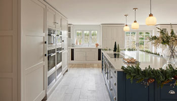 Boasting a host of luxury Miele appliances, a quartz island, larder and pantry, this bespoke Aegean blue kitchen makes cooking up a festive feast a real Christmas treat.